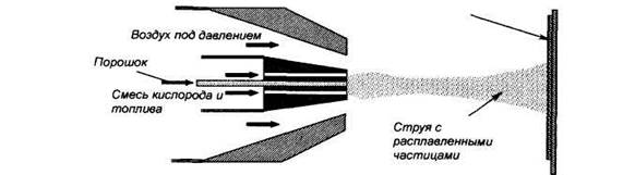 Газопламенное напылениепозволяет наносить покрытия из различных материалов на детали различной формы. Исходным материалом покрытия служит порошок или проволока, постоянно подаваемая в пламя горелки; после расплавления разогретым газовым потоком она переносится на покрываемую поверхность.