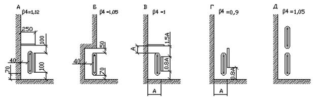 b4 – коэффициент, учитывающий способ установки радиатора в помещении (см. рисунок 10.);