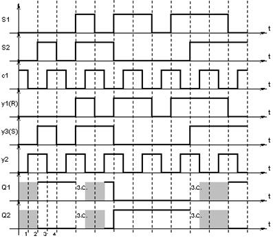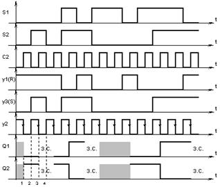 Например, если у номера варианта цифра № 6 = 0, цифра № 3 = 0, то на вход x1 подается сигнал S1, а на вход x2 подается сигнал S2. Изображённые на рис. 3 сигналы С1, С2 используются также для последующих задач. При выполнении задания необходимо нарисовать временные диаграммы в промежуточных точках y1 и y2, а также временные диаграммы на выходах Q1 и Q2. Все графики должны быть нарисованы один под другим, в одинаковых масштабах на миллиметровке или на листе в клеточку. На тех участках временных диаграмм, где состояние неопределённо, нарисовать пунктир. Те участки, которые соответствуют запрещенному состоянию, отметить – “З.С.”. В наиболее сложных местах целесообразно проводить вертикальную пунктирную линию через все графики.