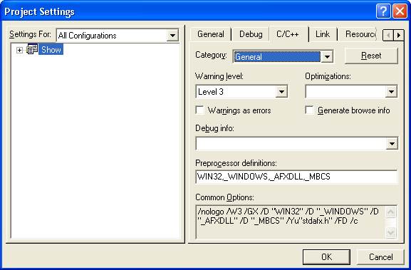 Для настройки опций компилятора следует выбрать в окне Project Settings вкладку С/С++. При этом окно Project Settings будет иметь вид как показано на рис. 3.