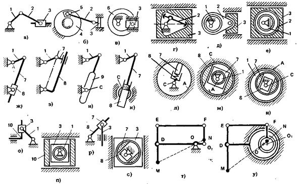 На рис. 2.11 на сх. а - е представлено конструктивное преобразование кривошипно-ползунного механизма, на сх. ж — н - кривошипно-кулисного механизма, на сх. о, п — синусного механизма, на сх. р, с — тангенсного механизма, на сх. т, у — механизма пантографа.