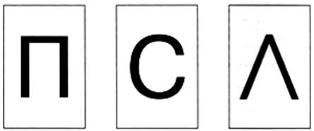 Предварительная работа: взрослый обучает детей четкому произнесению гласных звуков [а], [у], [и], [о] и согласных звуков [п], [с], [л]; знакомит детей с буквами А, У, И, О и соотносит их с соответствующими звуками; учит детей выделять начальный ударный гласный звук в словах «Аня», «аист», «адрес», «Уля», «утка», «ухо», «Ира», «ива», «иглы», «Оля», «окунь», «осень»—для этого первый звук в слове произносится с усиленным ударением или длительно пропевается. Взрослый вместе с детьми изготавливает из плотной бумаги карточки с буквами, необходимые для проведения занятия (образец для изготовления дан на рис. 4, с. 22).