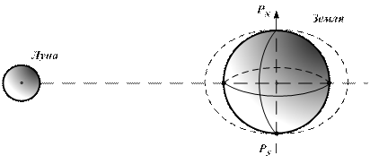 Под влиянием приливообразующих сил только Луны водная оболочка Земли теряет свою сферическую форму и принимает вид приливного эллипсоида, который своей большой осью всегда располагается в сторону Луны.