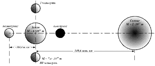 В соответствии с законом всемирного тяготения Луна и Солнце притягивают к себе каждую частицу Земли с силой (F) пропорциональной их массам (М) и обратно пропорциональной квадрату расстояния между Луной (Солнцем) и данной частицей Земли.