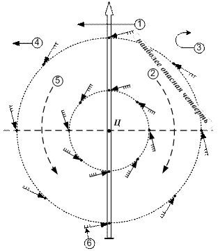 Случай 5.Если судно находится в левой передней четверти циклона и не может держать курс перпендикулярно пути движения циклона, то следует привести ветер на кормовые курсовые углы правого борта и идти полным ходом.