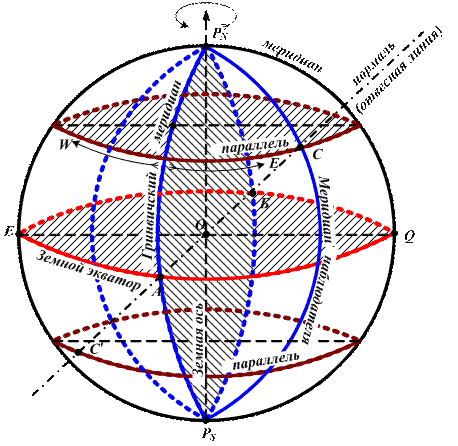 Южный географический полюс(PS) – полюс, противоположный северному. Плоскость экватора – плоскость, перпендикулярная земной оси и проходящая через центр шара (эллипсоида).