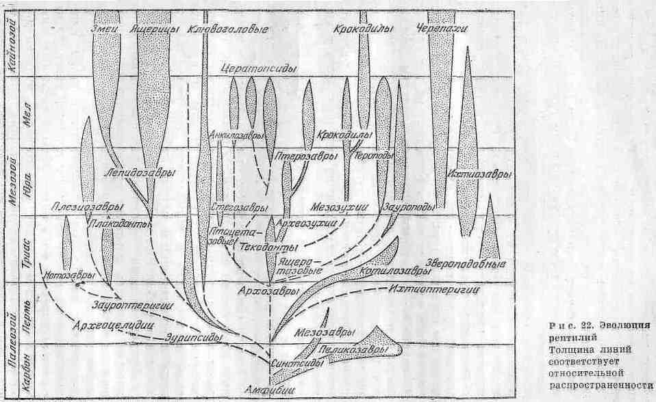 Родословные связи различных групп рептилий представлены на рир. 22. Наиболее примитивной формой из всех истаиаемых рептилий была сеймурия (Seymouria) - небольшое животное (от 0,5 м длиной), сохранившее ряд признаков земноводных. Практически у него отсутствовала шея, зубы имели примитивное строение, а кости черепа в деталях были сходны с черепной крышкой стегоцефалов. Детальное изучение сеймуроподобных рептилий и их остатков, найденных на территория СССР, позволило выделить группу батрехозавров, которые занимали промежуточное положение между земноводными и котилозаврами. По имеющимся данным палеонтологии и сравнительной анатомии можно заключить, что котилозавры были группой, которая дала начало всем другим основным группам пресмыкающихся.