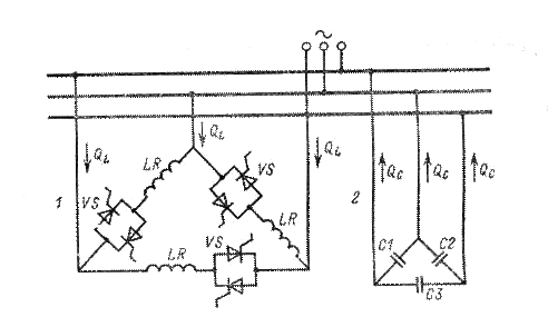 Статические тиристорные компенсирующие устройства.В сетях с резкопеременной ударной нагрузкой на напряжении 6–10 кВ рекомендуется применение не конденсаторных батарей, а специальных быстродействующих источников реактивной мощности (ИРМ), которые должны устанавливаться вблизи таких ЭП. Схема ИРМ приведена на рис. 5.2. В ней в качестве регулируемой индуктивности используются индуктивности LR и нерегулируемые ёмкости С1–С3.