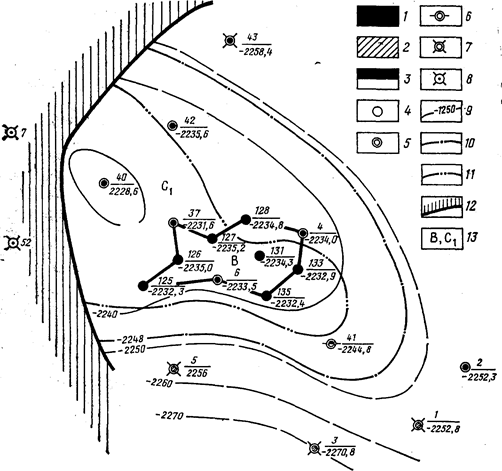 1 — нефть; 2 — вода: 3 — нефть и вода; скважины: 4 — добывающие, 5 — разведочные, 6 — в консервации, 7 — ликвидированные, в—не давшие притока; 9 — изогипсы поверхности коллекторов, м; контуры нефтеносности: 10 — внешний, 11 — внутренний; 12 — граница литолого-фациального замещения коллекторов; 13—категории запасов; цифры у скважин:
