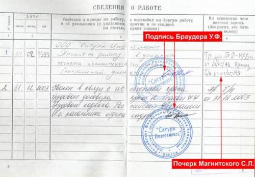 На трудовой книжке печать фирмы «Сатурн Инвестмент». Книжка подписана господином Браудером. Да-да, именно им!