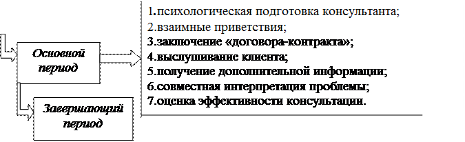 Начальный период консультирования.Устанавливается график и очередность консультаций. Консультант по возможности собирает информацию о будущих клиентах, на основе которой составляет предварительный план работы, намечает наиболее эффективные методы воздействия и определяет стиль общения с клиентом.