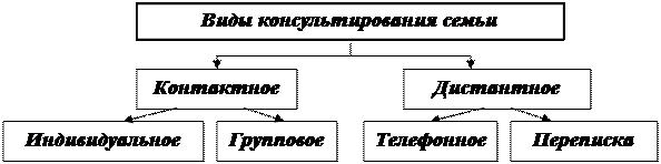 Индивидуальные консультирование. Индивидуальные консультации проводятся в том случае, когда разговор имеет отношение лишь к данной семье или когда именно эта форма работы может принести успех. Участники разговора взаимно заинтересованы в том, чтобы достичь взаимопонимания, обсудить проблемы в атмосфере откровенности, доверия. Именно такие встречи специалистов с семьей помогают найти не только наиболее эффективный способ решения проблемы, но и объяснение тем или иным странностям, загадкам поведения членов семьи. Кроме того, члены семьи получают рекомендации, со всей возможной полнотой учитывающие специфику семейных проблем и личные возможности членов семьи.