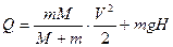 С самолета, летящего горизонтально на высоте Н со скоростью V, сбрасывают мешок с песком. Мешок (масса m) падает в грузовой вагон (масса M) и песок рассыпается по дну вагона. Найти скорость вагона и выделившееся тепло. Вагон первоначально стоял.