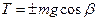 С горки постоянного наклона (угол β) спускается сцепка из трех одинаковых вагонов массы m каждый. Все колеса одинаково подтормаживают, поэтому скорость сцепки постоянна. Найти силу натяжения сцепок между вагонами.