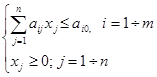 Для решения данной системы можно использовать следующий прием. Неравенства (1) и (4) преобразуют в равенства, вводя соответственно две группы дополнительных переменных nj, j=1÷ n и wi , i= 1÷ m. При этом nj ≥ 0 и wi ≥ 0. В результате от системы 1-6 переходим к системе 7-12.