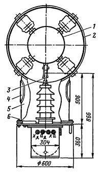 токопроводе 1, закрытом экраном 2. К патрубку 5 со смотровыми люками 4 болтами 6 прикреплена крышка трансформатора.