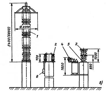 а – схема; б – конструкция; 1 – ввод; 2 – маслорасширитель;3 – фарфоровая рубашка; 4 – основание; 5 – коробка вводов НН.