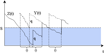 При использовании данной стратегии в качестве индикатора, используемого для определения момента заказа, применяется фиктивный уровень запаса - Y(t). Он представляет собой сумму наличного запаса на складе и количества продукции, находящейся в процессе доставки. Стратегия заключается в следующем: при достижении фиктивным уровнем запаса Y(t) "точки заказа" S осуществляется новый заказ.