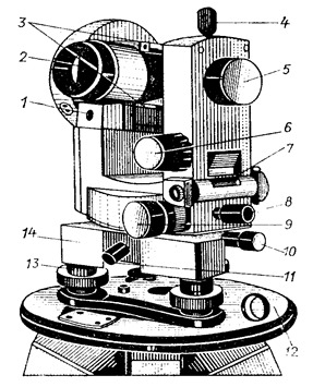 Рис.25. Теодолит Т-30. 1—уровень накладной; 2— объектив зрительной трубы; 3— визиры: 4—зажимной винт зрительной трубы; 5—кремальера зрительной трубы; 6 — наводящий винт зрительной трубы; 7—уровень; 8—зажимной винт алидады горизонтального круга: 9 — наводящий винт алидады горизонтального круга; 10 — наводящий винт горизонтального круга; 11—зажимной винт лимба горизонтального круга; 12— основание прибора; 1З—подъемный винт подставки; 14 — подставка (трегер)