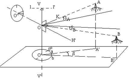 Вертикальные углы отсчитываются от некоторых линий относимости измерений. За такие линии приняты отвесная линия VV/ и перпендикулярная к ней, горизонтальная линия ОН/. Вертикальный угол между проекцией направления на горизонтальную плоскость и между направлением на данную точку называют углом наклона (dА, dВ).