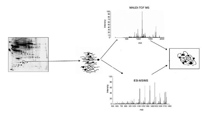 3. Идентификация миросеквенированием основана на определении (расшифровке) части аминокислотной последовательности белка. Разработанные методы микросеквенирования позволяют работать с очень малыми количествами пептидов - вплоть до нанограммовых. Это важно, так как определение даже короткого фрагмента аминокислотной последовательности часто оказывается решающим для идентификации целого белка. В настоящее время возможно как проведение прямого N-концевого секвенирования белка, перенесенного на инертную мемебрану, так и секвенирование отдельных пепетидов, полученных из изучаемого белка после его ферментативного расщепления высокоэффективной жидкостной хроматографией. Микросеквенирование позволяет выявлять одиночные аминокислотные замены в анализируеемых белках.