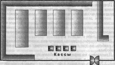 Линейно-штабной типпланировки свойственен крупным магазинам и предполагает параллельные ряды стендов с полками и их совмещение с прилавками, стоящими по периметру торгового зала (рис. 3.8). Примером может служить планировка магазинов «Рамстор», «Перекресток», «Копейка» и других супермаркетов и дискаунтеров.