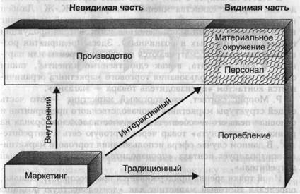 Таким образом, для того чтобы эффективно управлять маркетингом на фирме, предоставляющей услуги, необходимо использовать три вида маркетинга, регулирующие указанные взаимоотношения. Традиционный маркетинг направлен на звено «руководство компании — потребитель» и связан с вопросами ценообразования, коммуникаций и каналами распространения. Внутренний маркетинг направлен на звено «руководство компании — контактный персонал» и связан с мотивацией персонала на качественное обслуживание потребителей. Наконец, интерактивный маркетинг направлен на звено «контактный персонал — потребитель» и связан с контролем качества оказания услуги в процессе взаимодействия персонала и потребителей.