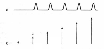 Рис. 8. Независимость силы сокращений миокарда (а) от силы раздражителя (б) – закон «все или ничего». Пороговый стимул отмечен звездочкой.