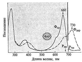 Для сравнения показаны положения максимумов поглощения Р680 и Р700. ФАР — область фотосинтетически активной радиации