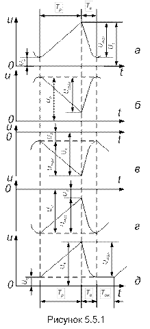 Если ГПН работает в автоколебательном режиме, то на его выходе будет формироваться одна из разновидностей напряжения, показанная на рис. 5.5.1-а-г. Если ГПН работает в ждущем режиме, цикл его работы помимо рабочей стадии и стадии восстановления содержит стадию ожидания (рис. 5.5.1-д), в течение которой напряжение не изменяется. В этом случае период повторения импульсов Т = Тр +Тв +Тож, где Тож -время ожидания. Выходное напряжение ГПН характеризуется прежде всего максимальным значением перепада напряжения за время рабочей стадии Umax = |Ul-U0|, длительностями рабочей стадии Тр и стадии восстановления Тв.