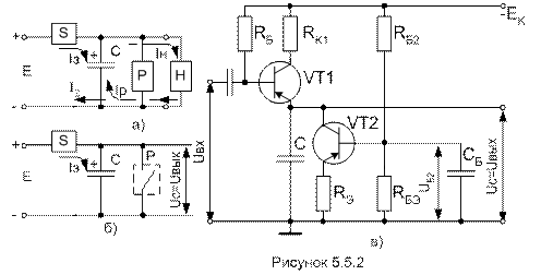 В момент прихода отрицательного управляющего импульса транзистор VT2 открывается, напряжение на его коллекторе уменьшается практически до нуля и конденсатор С начинает перезаряжаться через открытые транзисторы VT1, VT2 и резистор R под действием напряжения ≈ 2ЕK. При этом на резисторе R появляется падение напряжения от тока перезаряда конденсатора, уменьшающее отрицательный потенциал на базе транзистора VT1, в результате чего VT1 входит в активный режим. С этого момента сопротивление VT1 следует за изменением тока перезаряда конденсатораС, так как при уменьшении тока увеличивается отрицательное напряжение на базе VT1 и уменьшается его сопротивление, т. е. отпирание транзистора VT2 приводит к включению конденсатора С между входом (базой) и выходом (коллектором) транзистора VT1. Такое включение обеспечивает отрицательную обратную связь, стабилизирующую ток коллектора, и полностью соответствует структурной схеме (рис. 5.5.4-а). Восстановление схемы определяется временем заряда емкости Счерез сопротивление RK.