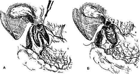 А - стенка 12-перстной кишки рассекается по краю язвы. Б – завершающий момент пилоропластики после экстрадуоденизации язвы.