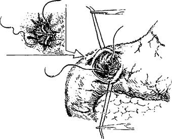 Выполнение органосохраняющей операции при этой локализации язвы чаще не встречает трудностей. После пилородуоденотомии язвенный дефект прошивают на всю глубину узловыми шелковыми швами (кровотечение из краев язвы) и операцию заканчивают пилоропластикой. Если при осмотре язвенного дефекта обнаруживают, что кровотечение происходит из аррозиро-ванной артерии в дне язвы, то для надежной остановки кровотечения предпочтительнее наложить обкалывающие швы через ткани язвы в проксимальном и дистальном участках кровоточащей артерии; над центром аррозирован-ного сосуда для выключения анастомозирующих ветвей необходимо наложить дополнительный Z-образный шов (рис. 3). При больших, пенетрирующих в структуры гепатодуоденальной связки и головки поджелудочной железы дуоденальных язвах, как правило, со стенозом, следует отдавать предпочтение пилоропластике по Финнею с экстрадуоденизацией язвы (см. рис. 1).