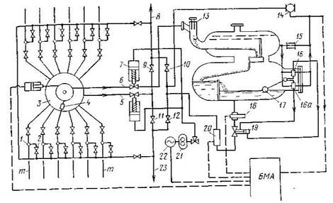 1 — обратные клапаны; 2 — задвижка; 3 — переключатель скважин многоходовой (ПСМ); 4 — роторный переключатель скважин; 5 — общая линия; 6— замерная линия; 7 — отсекатели потока; 8—коллектор обводненной нефти; 9, 12 — задвижки закрытые; 10, 11 — задвижки открытые; 13 — гидроциклонный сепаратор; 14 — расходомер газа; 15 — регулятор перепада давления; 16, 16 а — золотники; 17 — датчик уровнемера поплавкового типа; 18 — расходомер жидкости ТОР-1; 19 — поршневой клапан; 20 — влагомер; 21 — гидропривод; 22 — электродвигатель; 23 — сборный коллектор; т — выкидные линии от скважин; БМА — блок местной автоматики