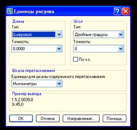 2. Из раскрывающегося списка Туре(Тип) в поле Length(Линейные) выберите формат единиц измерения Decimal(Десятичные). Этот формат представляет линейные величины в произвольных единицах. Форматы единиц Engineering(Инженерные) и Architectural(Архитектурные) представляют линейные величины в футах и дюймах, причем единица измерения рисунка соответствует одному дюйму.