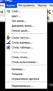 1. Подведите указатель курсора к строке меню и выберите в ней Format (Формат). Ниже курсора появится выпадающее меню (рис. 4), которое используется для работы с именованными объектами чертежа. Выберите в нем Units(Единицы). Появится диалоговое окно Drawing Units(Единицы рисунка) (рис.5).