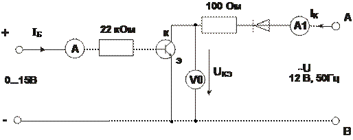 - Соберите цепь согласно схеме (рис. 4.2.2). В этой цепи в качестве источника синусоидального напряжения используется линейное напряжение трехфазного генератора, а диод включен для исключения обратного напряжения на транзисторе. Приборы А1 и V0 – входы коннектора, служащие для вывода тока IК и напряжения UKЭ на виртуальный осциллограф. Миллиамперметр А служит для измерения тока базы и может быть как мультиметром, так и виртуальным прибором.