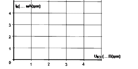 - Регулируя тока базы от 0 до максимального значения и наоборот, пронаблюдайте за изменением кривой IК(UKЭ) на осциллографе. При нескольких значениях тока базы (включая нулевое и максимальное) перерисуйте кривую IК(UKЭ) с осциллографа на рис. 4.2.2. Не забудьте указать масштабы по осям и токи базы для каждой кривой.