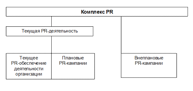 Таким образом, плановые внутренние кампании являются элементом текущей PR-деятельности организации. Внешние внеплановые кампании выходят за рамки этой деятельности, осуществляются параллельно с ней и в отдельных, чаще всего кризисных, случаях на определенный период времени заменяют собой эту деятельность. В результате комплекс PR в организации может быть представлен в следующем виде следующей схемы рис. 1).