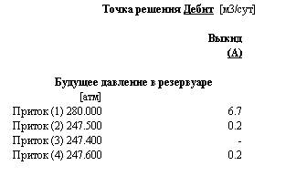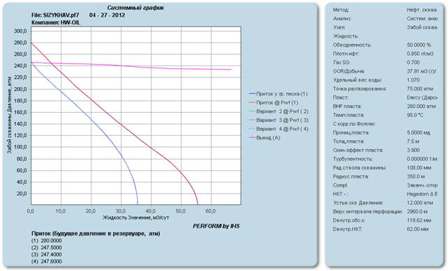To calculate reservoir pressure, with which well still will be producing fluid and having current water cut (50%) different pressures were tried out in program “Perform” using special function “sensitivity analysis”. Obtained reservoir pressure equals 247,4 bar: