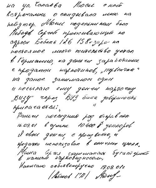 В середине октября 2001 года мы совершенно неожиданно получили огромный объем информации и ряд ценных документов, которые позволили нам понять, как выглядит схема торговли первитином в нашем городе. На верху пирамиды находятся некто Сергей Лебедев (ныне Эдигер, 3 судимости) и его жена Яна, которые торговали наркотиками на углу Комсомольской – Малышева еще в начале 90-х. Сейчас они живут во Франкфурте.