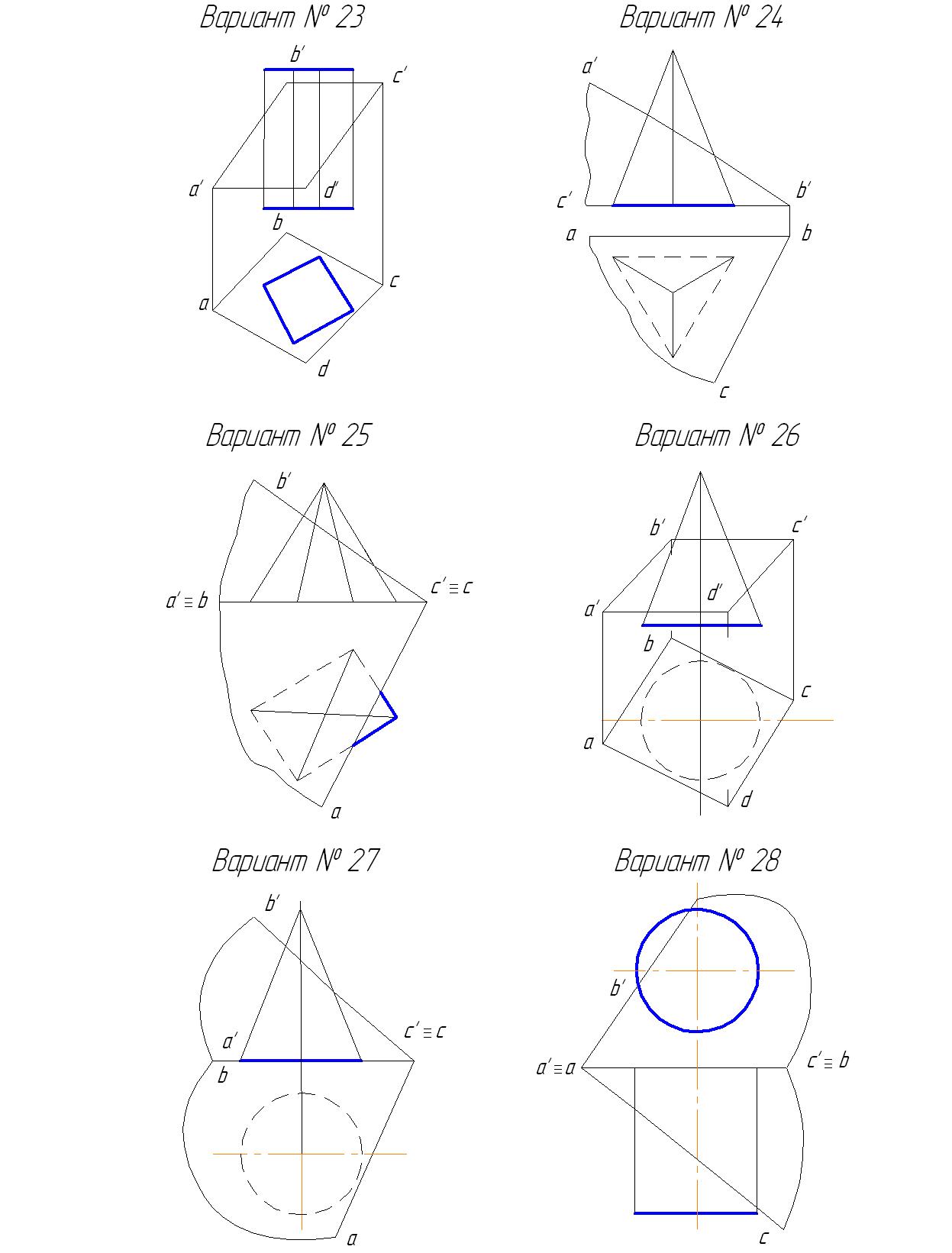 Окончательная обводка чертежа карандашом выполняется с соблюдением типов линий по ГОСТ 2.303-81: видимый контур поверхности геометрического тела, видимые ребра многогранников видимый контур секущей плоскости или ее следы обводятся сплошными толстыми линиями толщиной S (около 1 мм); невидимый контур геометрического тела, секущей плоскости, а также невидимые ребра многогранников – штриховой линией толщиной S/2 (около 0,5 мм); оси проекций, вспомогательные построения и линии проекционной связи – сплошной тонкой линией толщиной S/3 (не менее 0,3 мм). Секущая плоскость считается непрозрачной.