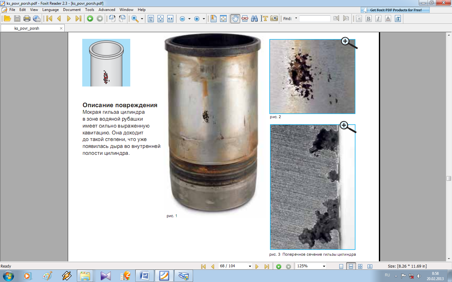 Мокрая гильза цилиндра в зоне водяной рубашки имеет сильно выраженную кавитацию. Она доходит до такой степени, что уже появилась дыра во внутренней полости цилиндра.