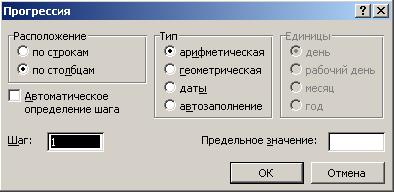 Якщо необхідно ввести члени прогресії (арифметичної чи геометричної), можна скористатися вбудованою функцією заповнення. Для цього введіть перший член прогресії потрібну комірку, виберіть команду Правка Þ Заполнить ÞПрогрессия, у діалоговому вікні (мал. 1.4),яке відкриється, задайте потрібні Вам опції: розміщення, тип, крок, граничне значення. Після натискання кнопки ОК послідовність чисел розміститься у потрібному діапазоні.