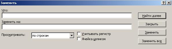 Вікно Заменить (мал. 1.12) відрізняється від вікна Найти наявністю поля Заменить на, де вказується текст, на який замінюється знайдена інформація. Вказавши параметри для пошуку та заміни, потрібно натиснути кнопку Найти далее. Курсор потрапляє на перше входження потрібного тексту в електронну таблицю. Якщо користувачу потрібно замінити цей текст, то слід натиснути кнопку Заменить.В іншому випадку – натиснути кнопку Найти далеедля пошуку наступного входження тексту. Кнопка Заменить вседозволяє замінити даний текст по всій електронній таблиці.