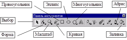 Построение любого изображения основано на принципе декомпозиции (расчленении) его на простейшие составляющие элементы и последующем их взаимодействии. Элементы (примитивы) сведены в одну панель – панель инструментов, которая содержит также и пиктограммы наиболее часто используемых диалоговых окон.