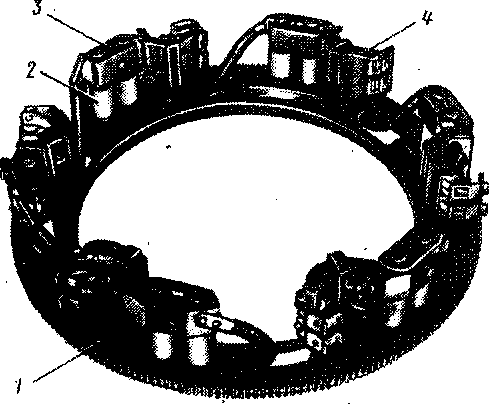 Щеточный аппараттягового электродвигателя состоит из траверсы разрезного типа с поворотным механизмом, шести кронштейнови шести щеткодержателей.