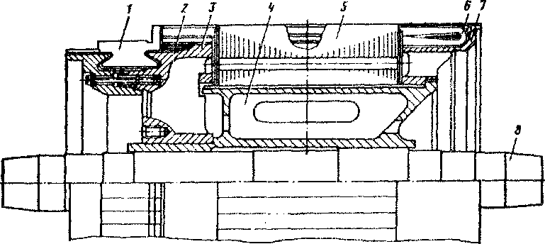 Коллекторная пластина; 2- уравнительное соединение; 3- передняя нажимная шайба; 4- стальная втулка; 5-сердечник; 6- катушка; 7- задняя нажимная шайба; 8- вал якоря