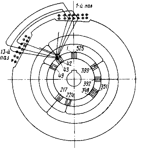 Каждая катушка имеет 14отдельных проводников, расположенных по высоте в два ряда и по семь проводников в ряду. Они изготовлены из медного провода ПЭТВСД размерами 0,9X7,1/1,32X758 мм. Каждый пакет из семи проводников изолирован также лентой стеклослюдинитовой ЛСЭК-5-ТПл толщиной 0,09 мм с перекрытием в половину ширины ленты. Корпусная изоляция пазовой части катушки состоит из пяти слоев стеклослюдинитовой ленты ЛСЭК-5-ТПл размерами 0,09X20 мм, одного слоя ленты фторопластовой толщиной 0,03 мм и одного слоя стеклоленты ЛЭС толщиной 0,1 мм, уложенных с перекрытием в половину ширины ленты. Коллектор электродвигателя с диаметром рабочей поверхности 660 мм набран из медных пластин, изолированных друг от друга армированным коллекторным слюдопластом марки КИФЭА (ТУ 21-25-17-9-84), число пластин — 525. От нажимного конуса и втулки коллектора корпус коллектора изолирован корпусной изоляцией и изоляционным цилиндром, изготовленным из комбинированных материалов. Наружный слой — формовочный миканит марки ФФГ - О,З (ГОСТ 6122 — 75*), внутренний — пленкостеклоткань ГТП-2ПЛ (ТУ 16 503.124-78) толщиной 0,2 мм.