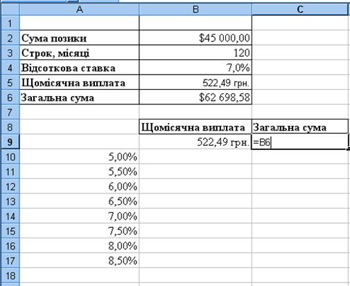 В комірки В8 і С8 ввести написи з комірок А5 і А6 (Щомісячна виплата і Загальна сума). А в комірки В9 і С9 – посилання на комірки з формулами, за якими буде обчислено результат. В нашому випадку потрібно виконати посилання на комірки В5 і В6.